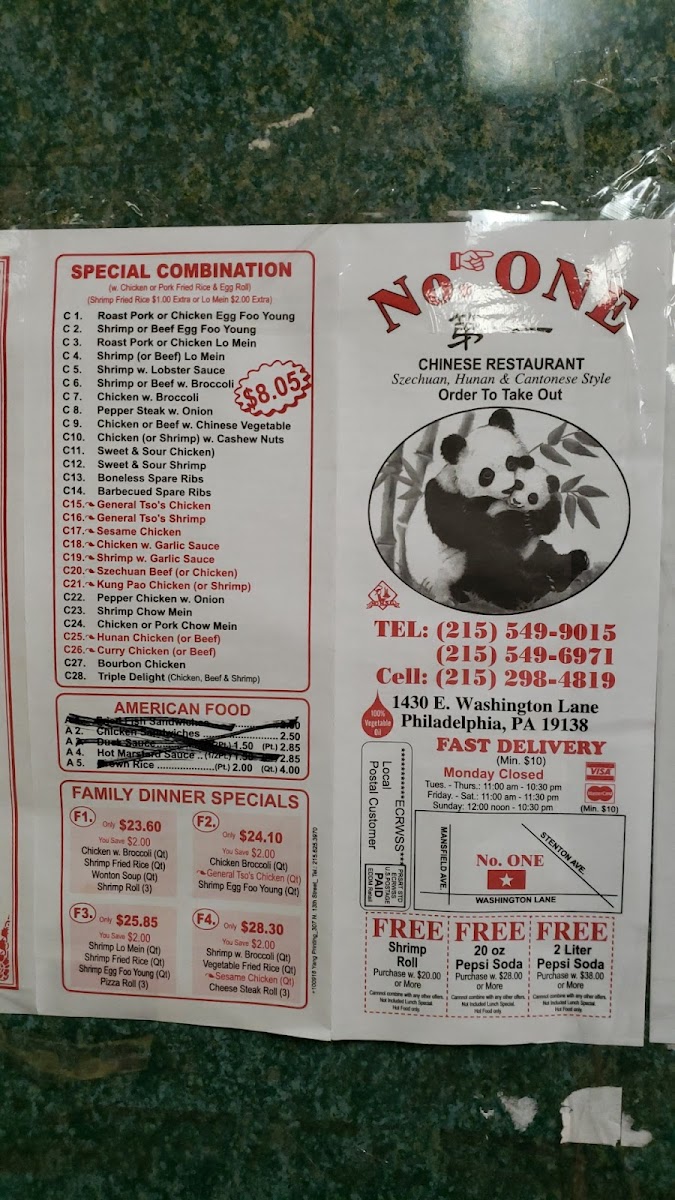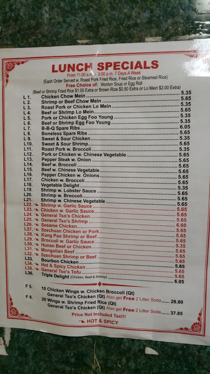 From a reviewer’s perspective, the menu at No 1 Chinese Restaurant offers a familiar yet satisfying snapshot of classic Chinese-American comfort food, bringing together variety and value in a concise selection. The Special Combination section highlights crowd-pleasing staples such as Chicken Egg Foo Young, Roast Pork Egg Foo Young, Shrimp Egg Foo Young, Beef Egg Foo Young, and Chicken Lo Mein, reflecting a balance between hearty protein choices and well-loved noodle dishes. Moving into the Family Dinner Specials, the menu leans toward sharing-friendly options with comforting pairings like Chicken W. Broccoli, Shrimp Fried Rice, Wonton Soup, and Shrimp Roll, which together create a complete, homestyle dining experience suitable for groups or families. The inclusion of Chicken Broccoli further reinforces the restaurant’s focus on dependable classics that appeal to a wide range of tastes. In the Others category, heartier and more indulgent selections stand out, especially Chicken Wings W. Chicken Broccoli (Qt), General Tso's Chicken (Qt), and the generous 20 Wings W. Shrimp Fried Rice (Qt) General Tso's Chicken (Qt), which cater to diners looking for bold flavors and substantial portions. Overall, the menu may not be overly extensive, but it succeeds in summarizing what No 1 Chinese Restaurant does best: delivering recognizable dishes, comforting flavors, and practical combinations that make it an easy and reliable choice for casual dining or takeout.